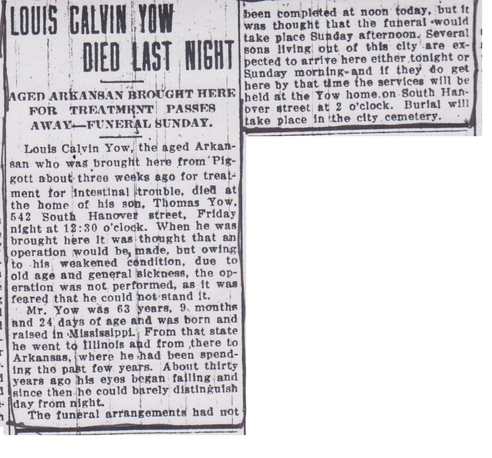 Lewis VanBuren Yow came to a tragic and sudden death at the age of 53 in a freak accident as described in this newspaper article: