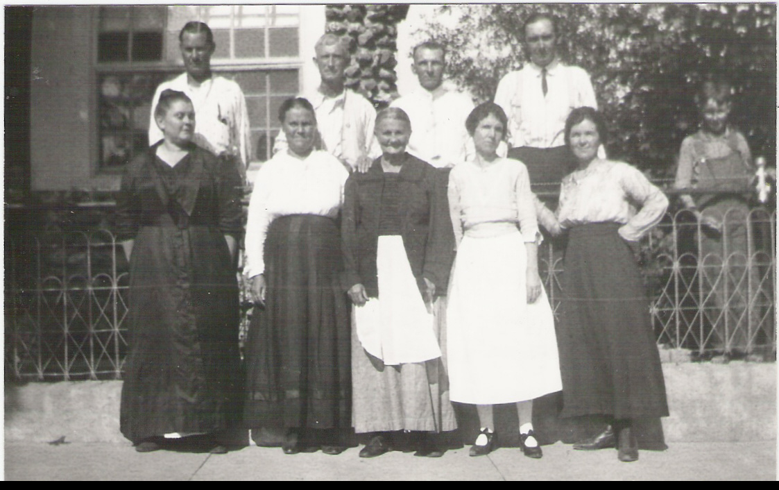 In the above photo, I don’t have all the names but Lewis VanBuren is on the left behind his wife, Rhoda. Sarah Elizabeth Cheek Yow, his mother (my great-grandmother) is in the center front row. Off to the right, behind the fence is Lewis’ and Rhoda’s son, Nathan. I believe this photo was taken in Marquand IL.